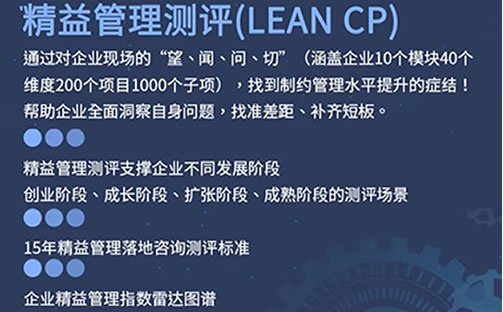 精益管理測評系統(tǒng)是基于整個精益制造模型而發(fā)展的診斷模型,覆蓋客戶全價值流從供應商端到客戶端的精益實施狀況,通過測評系統(tǒng)使用者能清晰的了解到目前在組織內流程的精益狀態(tài),也能了解從現(xiàn)有的狀態(tài)達到目標狀態(tài)的大概步驟和適用工具,從而為制造業(yè)最重要的價值增值過程改善提供決策依據(jù);針對十大科目實施線上診斷與線下服務,通過對企業(yè)現(xiàn)場的“望、聞、問、切”(涵蓋企業(yè)10個模塊,40個維度,200個項目及1000個子項),找到制約管理水平提升的癥結!
